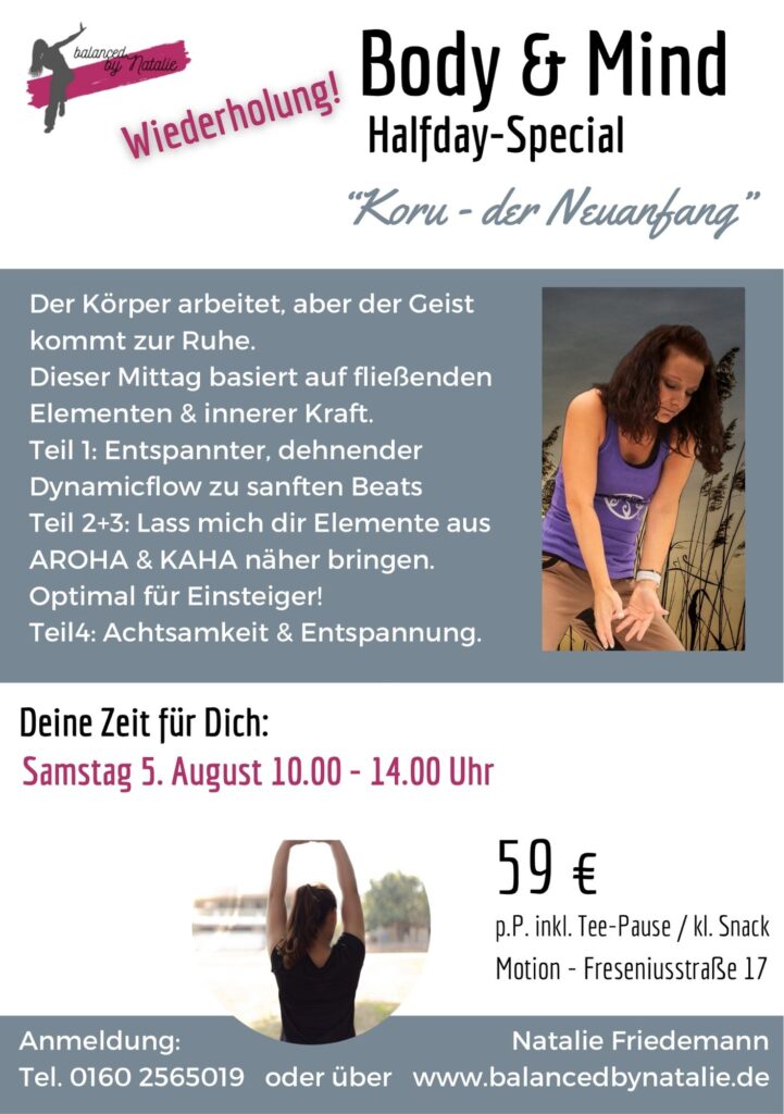 Lerne meinen Dynamic Flow kennen, der deinen Faszien und deiner Beweglichkeit gut tut. Darauf folgen KAHA und AROHA Sequenzen. Finde hier heraus, was entscheidende Kraft-Elemente im Wechsel von Anspannung und bewusstem Loslassen für dich tun können. Eingerahmt in unser Motto „Koru“ („der Neuanfang“). Wir beginnen mit einer meditativen Sequenz und beenden den Mittag ebenso mit viel Entspannung und Achtsamtkeit.
